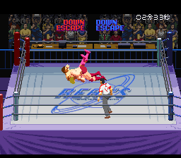 There are a multitude of graphical touches that you just didn’t see much, if any, of during the 16-bit era. Before each match you get to see your the wrestlers enter the ring on a jumbo-tron, with a laser light show in the foreground, before the screen pans down to the ring (this can be skipped by just pushing Start). During matches, there are all kinds of subtle touches that show just how much care went into making the game. For example, your character might smack the canvas with their palm out of frustration after just coming up short of getting a 3 count after an attempted pin. They’ll also react very strongly to getting hit, and after they’ve been thoroughly abused they’ll stand hunched over, as if they were completely exhausted. You can also make them strike ridiculous poses by pushing Select.