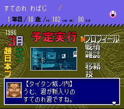 Jikkyou Power Pro Wrestling doesn’t have any kind of normal create-a-wrestler, but you do get to make your own character in Max Voltage mode. Your sprite is pre-made, but you do get to name them, and select their date of birth (which has no relevance whatsoever) and their sporting background (which has a VERY mild effect on their initial moveset). The available options for sporting background are mostly martial art styles, but there’s also the very odd choice of basketball (?). The game saves your progress through Max Voltage mode, and if you finish the entire career mode then you can select your customized character in exhibition matches.