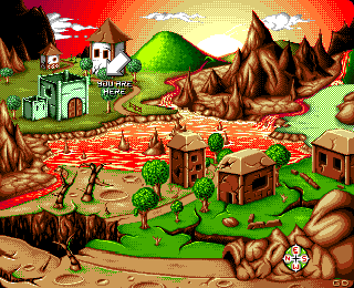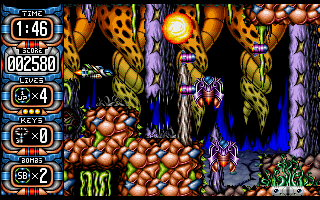 A short time after the SNES release, the game was ported to DOS. This game has some notable differences from the SNES version. While the graphic style and story remain the same, it has increased resolution and better overall graphics with more black outlines to enhance the comic book look. Because the overhead stages in the SNES game uses Mode 7 extensively to rotate the stage itself when Jim turns around, they have been changed in the DOS version so that the stage remains static and your sprite controls more like in Sega’s Alien Syndrome. Before each stage you also get a CGI render of the stage you about to embark on. There’s also a bar on the left side of the screen that shows your life count and inventory. The biggest addition to the DOS version is the lifebar however. Yes, you now have a lifebar allowing you to be hit 3 times before you die. This makes such a huge difference to the gameplay like you wouldn’t believe. Because of this revolutionary addition, this game is by far the best game of all Jim Power games produced and actually fully playable. The only major drawback is the music which isn’t as good as it is on the SNES.
