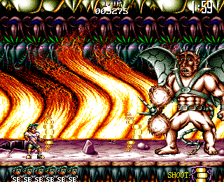 There is something to be said about the art direction and originality of this game. There is non. First off the enemies have no consistency and are all a random mess of Roman centurions, Egyptian cats, flying mushrooms and pelvis pushing bald men. It also steals from a lot of other games, most notably Ghosts ‘n Goblins as mentioned. The scenery is similar, the basic storyline is the same and the final boss is pretty much identical to that found in Ghosts ‘n Goblins. The only all original and inspired part of this game, is the music which is incredible in every way. High energy rock with glorious Amiga guitar samples with Stage 3 having an exceptionally good sound with a strange but suitable emotional melody. Hülsbeck really went to town with this score, combining his by now trademark heroic motifs with Japanese game music inspirations which was highly unusual at the time and even today, is only found in a few composers like Jake Kaufman of WayForward. Some songs have very strong similarities to that of Ys, but whether this is intentional or a coincidence is hard to say. As amazing as the classic Turrican soundtrack is, Jim Power might be the best of Hülsbeck’s incredible catalog. Apart from the music, there’s little new and original to be found in this game, hell even when looking at the box, there’s something very familiar…