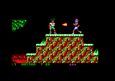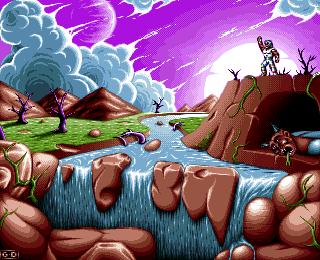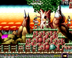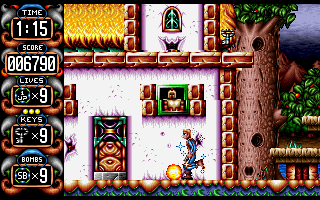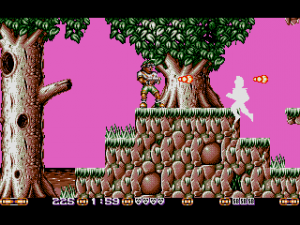 The game’s selling points when released was its technical achievements. For its time it actually does boost some very impressive technical aspects, the backgrounds are quite colorful and detailed, the music as mentioned earlier is absolutely amazing and most of all according to the box, the game has 12 layers of parallax scrolling. But sadly for Loriciel the main selling point is probably its biggest problem. You see each layer scrolls in different ways and directions as Power runs across screen. The foreground will remain stationary, while the background will go in the opposite direction as the way you are running at different speed and pace, leading to some amazingly confusing parts. A lot of the game takes place on bouncing platforms at high speed, so imagine concentrating on Power who goes up and down at a certain tempo while the background goes in the opposite rhythm and direction. The parallax scrolling doesn’t help the game, it actually damages it by guaranteeing you a headache within the first few minutes of playing.