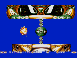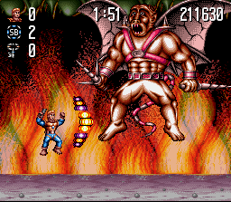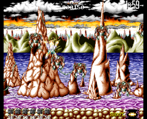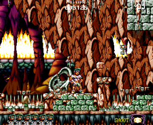 The game is 5 stages long and separated by 2 styles of gameplay. Side scrolling platformer and horizontal shooter. At the end of each level you will fight a big boss which most likely will kill you before you even realize what you’re supposed to be hitting. Despite only being 5 levels the side scrolling stages are so long and difficult with more than one miniboss scattered throughout. The first level alone takes up towards 10 minutes to beat if you are running through it. The shooter stages however are around a minute in length and will suddenly just go black and transport you to a boss battle, and are fairly easy to beat.