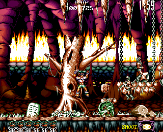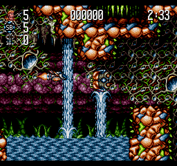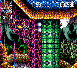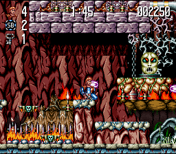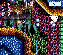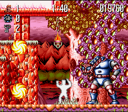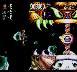 The horizontal shooter stages makes a return here looking much different from how it was in the prequel. In Mutant Planet you control Jim in a tin man rocketeer suit while here you control a space ship and fly through cavern bio infested caverns like in Life Force. The graphics are still a bit inconsistent but has seen a major face lift. Though most enemies remain the same in design they look much more detailed and rich in this game thanks to the SNES’s superior color palette. Especially during the new space ship stages you’ll see some really nice looking backgrounds which has a very Marvel comic book look to it in terms of color use and shadowing.