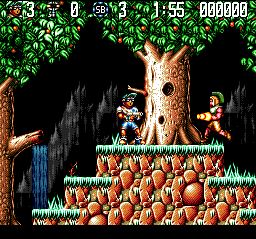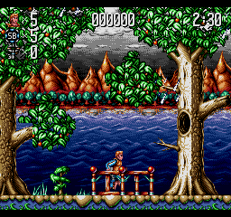 Enemies are now twice as fast and twice as many. From the very first moment you start playing and meet enemies, they’ll be charging at you so fast that your reflex skills better be at the height of their game. The jumping physics are no longer a problem, but the moving platforms definitely are. They now move so fast and with the insane scrolling mechanics in the background it’ll make some jumps incredibly hard to maneuver. You start out with 3 lives and 3 continues which doesn’t last you very long either. When you lose a life you are sent back a few steps and gain a few seconds of invincibility and when you die completely, you gotta restart the level, which as usual is puzzlingly long.
