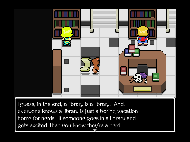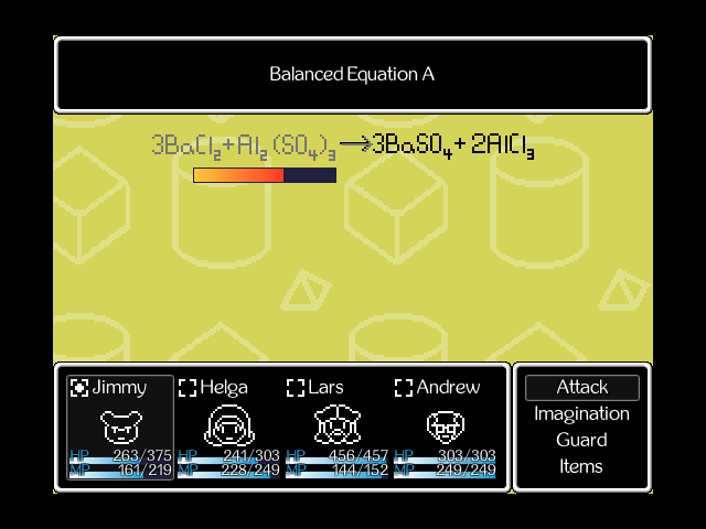 The game’s enemies are very creative and even wackier than Earthbound’s. Such as shapes that attack “the appropriate number of times.” A chemistry equation in two parts that “rebalances” itself by reviving its dead half if you kill half of it. A surfer who sometimes randomly wipes out and defeats herself. Parodies of the Twilight protagonists, who are called “Romancepires.” A gang member named Big Enormous, who later shows up in a mutated form named “Big Enormous Slug.” There’s a lot of humor in the battle descriptions as well, such as the sage who “sees a beating in his future” during the fight.