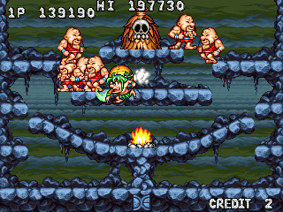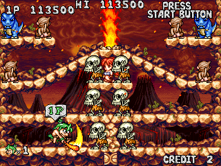 Once again Data East makes another spiritual sequel to Tumblepop, this time by mixing it with another of their properties, Joe & Mac. It sounds strange, but it actually works surprisingly well and manages to merge gameplay elements of both games in a coherent way, as opposed to the incoherent mess that was Diet Go Go. Sadly, this makes the final game for both the Tumblepop legacy and the two cavemen, but at least they went out in style.