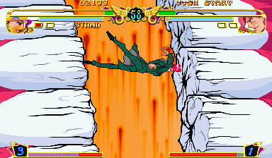 The soundtrack of the series is also notable, as it is one of the more underrated ones in Capcom’s history. The heroes’ themes are fitting, and, well… heroic. Polnareff’s sounds like a Mega Man X or VS game soundtrack with quite an upbeat tempo. The real strength of the soundtrack, however, lies in the themes for the villains. There is a perfect blend of atmospheric and ambient music. Few of the themes are as fast-paced as that of typical fighting games, with Dio, Chaka and Midler’s themes sounding far more relaxed, yet dark and mysterious. The other key compositions in the series are the raw intensity of Vanilla Ice’s (Iced) theme (which is perfect boss music) and the strange and unsettling themes of Devo (or D’Bo), Alessi and Death 13. These fit perfectly not only in terms of characterization, but the supernatural and suspenseful elements of the series.