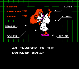 The premise of the game is that in the future, “someone or something” has hacked into the mainframe computer and taken complete control over it. To make matters worse, this computer controls the nuculear weapons of the country, so this is a real crisis. The solution to their woes is to transfer the mind of someone into the computer itself as binary data to regain control, in what is a pretty clear homage to Tron. This is where our hero Scott O’Connor is introduced, and he is the first man to venture into this brave new world with the technology. One of the questions the game poses is that because the technology has never been tested on humans, we don’t know what will happen to Scott. Well, he becomes kabuki actor in the full get-up, with facepaint, long red spiked hair, and traditional Japanese clothes. The explanation for this is that one of Scott’s ancestors was a bona fide kabuki actor, which had some type of influence on him. The whole thing is really quite hokey and bizarre. Now when you do finally get past the title screen, you’re introduced to a screen of pseudo code (which is partly inspired by the 6502 ASM instruction set the NES uses) with the kabuki floating amidst. If for some reason, anyone should think something glitched out, everything is fine, as the game is just really weird. Thus the stage is set.