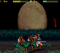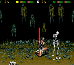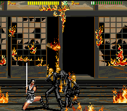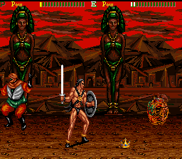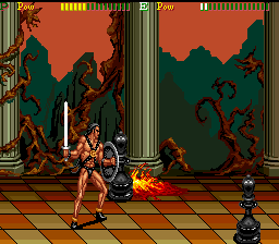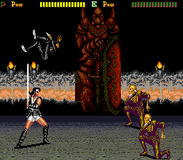 If you manage to survive, things take a turn for the weird from the third stage boss. You fight some sort of ogre that bursts open when defeated, releasing two kunoichi twins. After disposing of them, the samurai inexplicably becomes a barbarian warrior with sword and shield, and the next area is for some reason the checkered halls of a Western castle, swarming with morphing chess pieces, some of which are on fire (…what?). After having avoided a few falling chandeliers and destroyed some sort of gladiator hiding in a bigger chess piece, the barbarian confronts the painting of an armored knight with a lance that comes to life (the painting, that is). The next and last stage has an Arabian/Egyptian flavor to it, with mooks now able to parry hits; after having slaughtered the last enemy, a four-armed genie,. the game cuts right to the “Stuff” (hooray for Engrish) credits, not even bothering with a “Conglatulations!” or something.