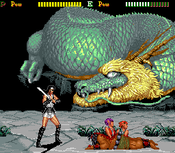 The graphics are decent for 1988, with big sprites and detailed backgrounds, like the the dragon at the end of the third stage (which also appears when you start the game, but whose purpose is never made clear). Too bad that the sprites are barely animated and seem to be slide on the ground: acceptable for the chess pieces, but looking stupid for everything else. It’s especially hilarious to see our hero sliding on his knee while crouching. The music is totally unremarkable and the various effects (cackles, grunts and yells) are very grating.