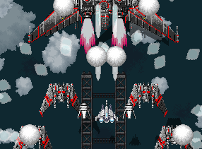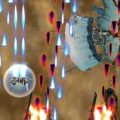 Scoring system revolves around medals dropped by fallen enemies. Collecting them does three things: raises the item rank, fills the gauge and raises the medal count. Item rank starts at G, where each medal is worth a mere 10 points, but the next rank multiplies that by 5 and another by 2 – a pattern repeating until each medal is worth 10000 at maximum rank A. Item rank, unlike the two other counters, must be raised in an unbroken chain: getting hit or failing to collect a medal brings it back to G. The gauge, when full, may be kept as an autoshield or spent as a bomb – this creates a whirlpool that kills regular enemies on contact, making them drop extra medals, worth as much as those from a higher rank (so 50000 when the rank is A). This whirlpool only damages bosses, but it turns their bullets into those same upranked medals. Speed-killing certain bigger enemies spawns waves of popcorn that make good targets for a bomb and a score boost – at the cost of protection. Medal count is a multiplier that modifies scores awarded for collecting hidden shields (uncovered by shooting at them) and killing bosses. Each boss’ bullets can be morphed into regular medals with two destructible parts or, at the moment of death, into star-shaped pickups, worth as much as medals two ranks higher of the current one (so x10).