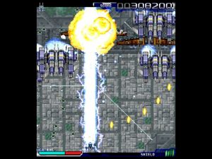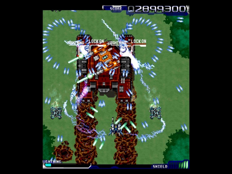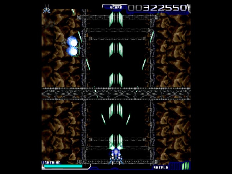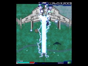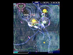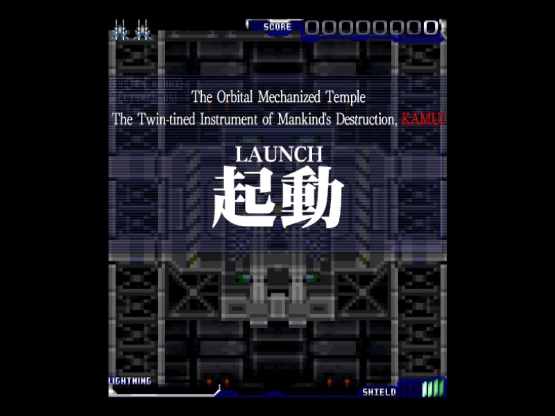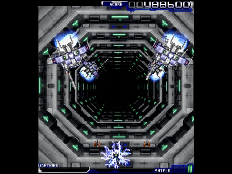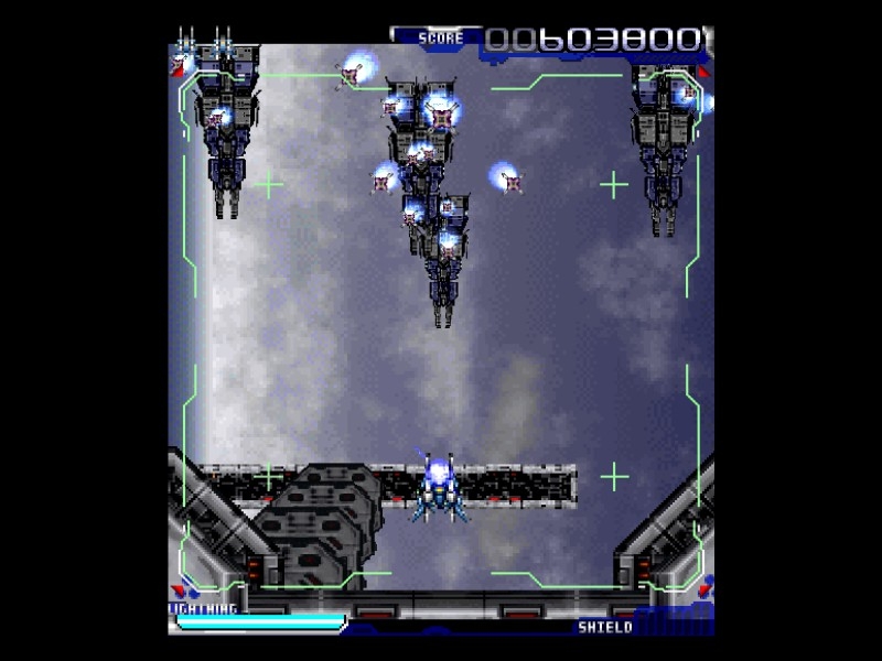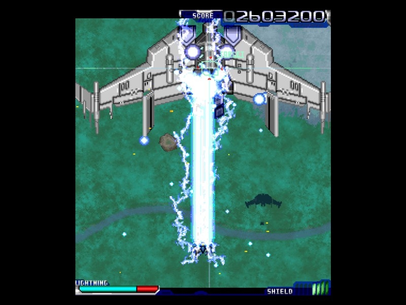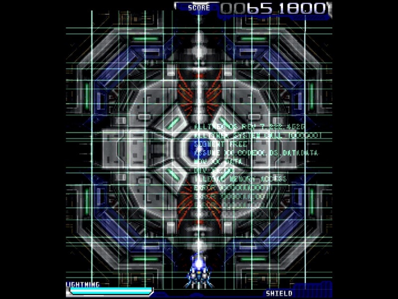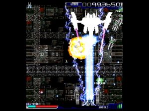 SITER SKAIN’s first game seems at first glance to be just a RayForce clone, and while this assessment indeed rings true, KAMUI is more than that. Much like in RayForce, the game’s play area is divided into foreground and background, and the player craft, the eponymous KAMUI, is equipped with weaponry to deal with both. The most basic weapon is an upgradeable pulse laser, initially rather weak and forward firing, and eventually not much stronger, but covering a large area and doing a decent job of clearing the foreground of weak enemies. The next weapon is the Lock-On Thunder, which is a lightning discharge that automatically targets every enemy, as well as missile, located in the background. The actual number of enemies hit depends on how charged the craft’s power meter is, and varies from one to sixteen – if there are fewer enemies than there are lightning bolts fired, some will be hit multiple times for greater damage. The last weapon equipped, used by pressing both attack buttons at once, is the Thunder Sword, which is a powerful, forward firing beam attack that deals enormous damage, and cancels any bullet or laser it comes in contact with, even sending some right back at the enemy. The catch is, it runs on the same power meter as the Lock-On Thunder, filling it from the other side and temporarily preventing recharge.