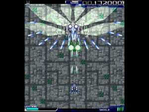 The game’s biggest weakness are probably its audiovisuals. The graphics side did not age very well and while it’s not repulsive by any means, it pales in comparison with other sprite based shoot-’em-ups – the colors are washed out, most enemies are a variation on “blocky shape on wings”, or “blocky shapes mashed together” (especially the player’s ship, whatever it’s supposed to be), and very few ships are actually animated, fewer still with more than a handful of frames. Furthermore, the scaling engine used to move ships between foreground and background or rotate them often generates tiny but still noticeable artifacts. The sound effects are as bland as they come and lacking in variety, each enemy sounding the same. The game redeems itself though with its amazing soundtrack: even though the instrument choice is more or less midi crossed with techno, every stage theme is at the very least good, with some, like the iconic Stage 1 – Final Hour, or Stage 4 – Worthless Creatures being plain amazing pieces of game soundtrack work that greatly contribute to the game’s somber, melancholic mood.
