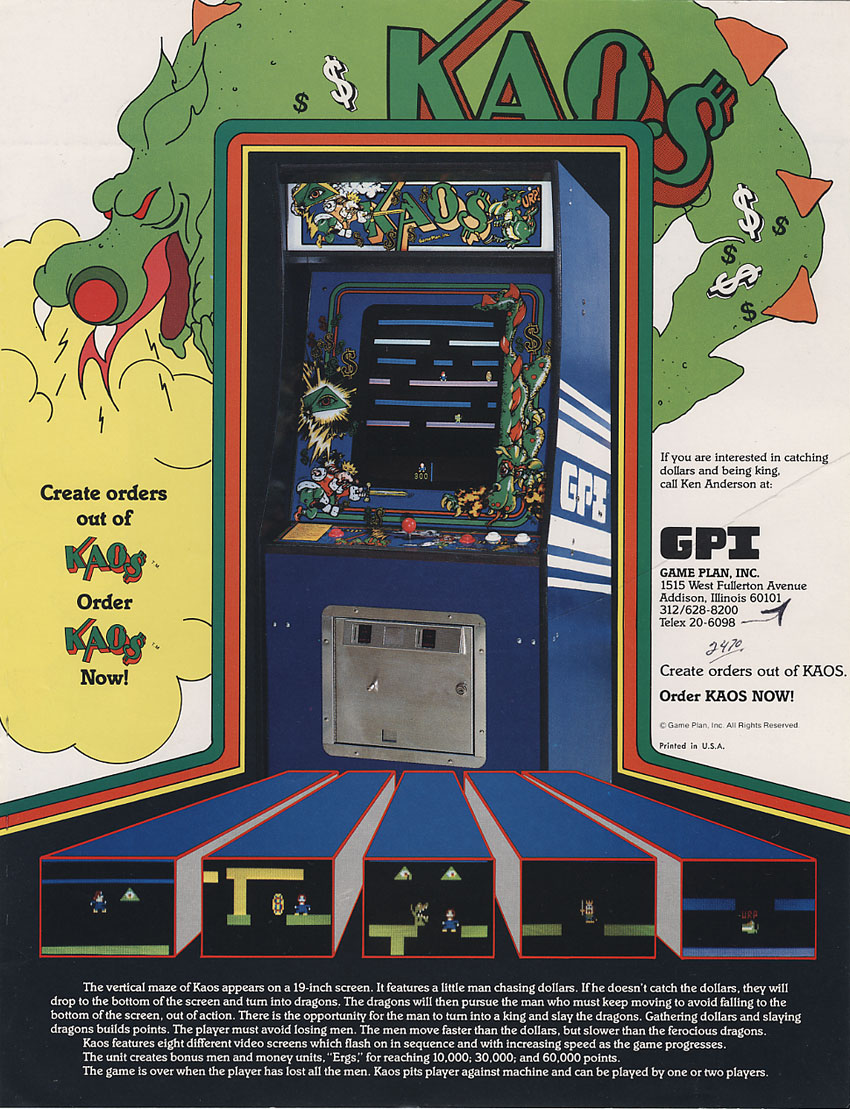 This is Kaos in a nutshell, and once you manage to cope with the constantly shifting platforms, it’s a fun little game. However, it is unfortunately saddled with frustrating collision detection when attempting to jump up through gaps. There’s this overall unpolished feeling to the game that makes it seem like it could have featured a bit more refinement in its collision and enemy behavior. It’s kind of weird how jerkily dragons ascend through gaps and frustrating how they just suddenly jolt up halfway across the screen and gulp you up. Still, while jumping through gaps above you can be a chore, this game is more enjoyable than its screenshots may suggest. There isn’t usually too much action going on at any given time, but it’s a lot harder to chase the coins than you may think, and if the coin hits the bottom of the area floor right as you’re about to grab it? Prepare to get dragon-chomped! So Kaos is a fine if not flawed game, but it scarcely grazed the same zenith of fame as Donkey Kong. It never came out to any known consoles or computers, not even the ColecoVision which could have potentially emulated its simple visuals without flaw. It’s still worth a play if you can track it down, and it proves that Mario wasn’t the only jumping man with a mustache who starred in his own game in 1981… if only the Kaos protagonist had a known name!