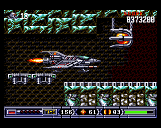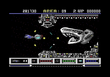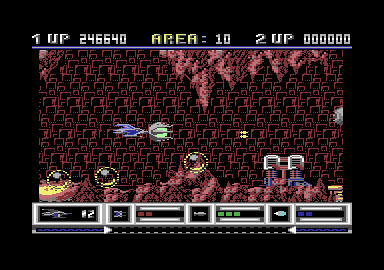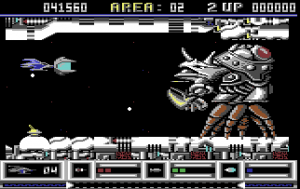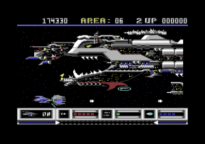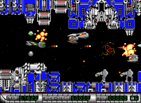 Game mechanics are mostly based on R-Type, mixed with some elements from Darius. Similar to R-Type, collecting a certain powerup attaches an indestructible force pod to the front of your ship. The force pod can be upgraded twice and comes in three colors: red replaces your main gun with a powerful beam, blue provides you with reflective lasers and green unleashes lots of shuriken-like projectiles that bounce wildly across the screen. The pod can be detached from the space bar, where it acts autonomously from the player. The pod can be attached to the front or rear part of the player’s ship and protects from enemies and bullets. It grows in size by collecting multiple power-ups of the same type. It is also possible to charge a laser blast by keeping the fire button pressed for a while and then releasing it.