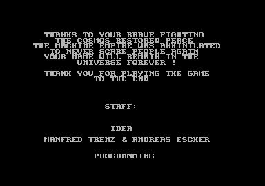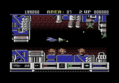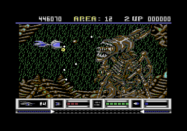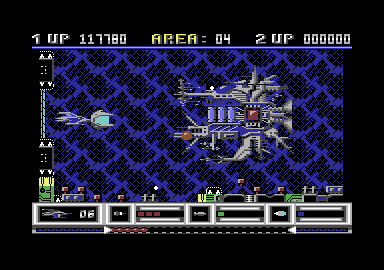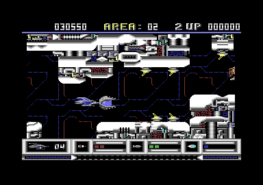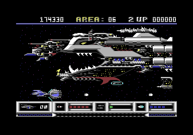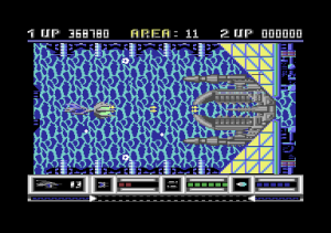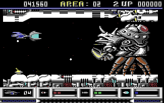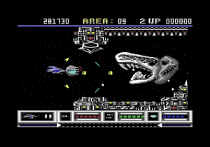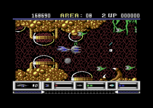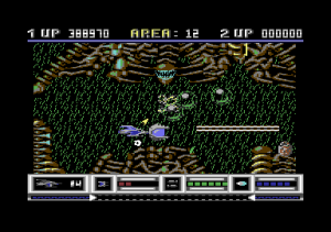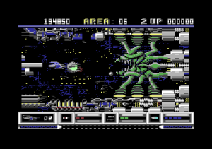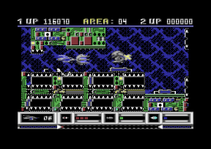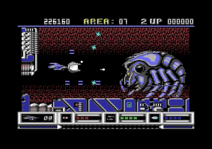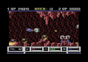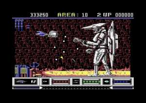 From a technical perspective, Katakis is nothing short of amazing for the C64. The game boasts multi-layered parallax scrolling, one level even has six different layers, running at a full 50 frames per second with very little slowdown. Level 7 features the ‘canyon’ scrolling effect featured two years later in MUSHA on the Genesis/Mega Drive only in a horizontal fashion; something few people previously would have considered to be possible on the C64.The parallax layers are all in hi-res mode while some levels have animated backgrounds like the boiling lava of level 10. Also, there is very little flickering despite a large number of on-screen sprites while the animated end bosses are huge for the system.