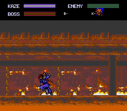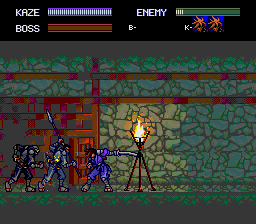 As with most action games of its era, the story’s an afterthought: a princess was kidnapped by ninjas at the service of an evil Lord, and the good ninja Kaze is sent to rescue her from the Lord’s castle. It’s basically Mario, except there isn’t Another Castle. It’s a beautiful afterthought, at least; the intro is colorful and stylish in the way only a (barely-animated) early ’90s anime intro can be. There are two endings; in the next-to-last battle, the princess stands around at the right of the screen, and if you hit her three times (accidentally or not), she dies, triggering the bad ending. Otherwise, you get her back, and flee the crumbling enemy castle by stealing a ninja’s hang-glider in mid-air while your rivals look up from below.