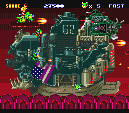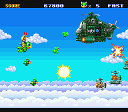 As far as shooters go, it’s pretty standard stuff – you have a primary weapon that can be powered up a few levels, and a multidirectional shot as well. Two tiny dragons also act as options, supplying extra firepower. If you’re missing these little helpers, all you need to do is stop shooting for a few seconds and they will magically appear out of thin air to help. There’s nothing really spectacular gameplay-wise that make Keio stand out, but it does have plenty of personality. Almost all of the enemies you fight are evil raccoons, either attacking on foot or riding some crazy machination. While not as crazy as Parodius or Cho Aniki, there’s some memorably wacky stuff, especially the fish-human who commands several bosses, including a giant mech with big googly eyes.