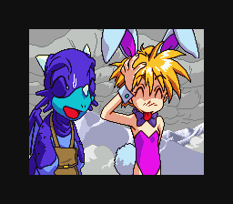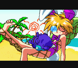 Keio Flying Squadron begins with an FMV intro that details the elaborate history of the game world. However, this has absolutely nothing to do with the game, which focuses on the Keio Yuugekitai. This squadron is made of three people – Rami and her two grandparents. They don’t do much of anything except sit around and guard this Special Holy Object, which is really just an oversized key. Unfortunately, they aren’t very good at guarding, and the key gets whisked away by the nefarious Dr. Pon, a raccoon with the IQ of 1400. Rami transforms into her rabbit costume (for no justifiable reason) and sets off to retrieve their treasure. Despite the implications of having a heroine that looks like a Playboy bunny, Keio Flying Squadron is actually 100%, family friendly, squeaky clean.