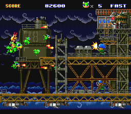 Other than the goofy bosses, the graphics are pretty mediocre. While the artwork in between levels are amusing, the in game graphics lack detail and obviously suffer from the low color palette of the Genesis. The music is impossibly upbeat and unnecessarily catchy, and the voice acting doesn’t take itself too seriously.