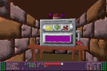 One particular innovation of the game is the aspect of money. You’ll often find coins and diamonds scattered around the levels, either in piles or hidden in safes. While the game doesn’t give you a lot of money early on, the further you play, the more generous it gets, until you often have more than enough for what you want. You’ll generally use money for toll doors and the occasional vending machine you’ll find, which offers a selection of every powerup in the game. If you’ve got the cash to spare, it’s possible to buy up a bunch of potions and cloak and give yourself plenty of time where enemies can’t hurt you at all, which is more than a little unfair. Sometimes you’ll also stumble on slot machines, and if you’re patient, you can save and load your game until you’ve got exactly the amount of coins that you want.