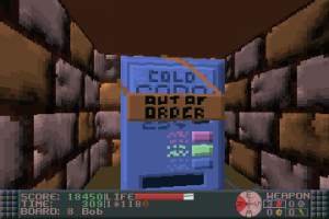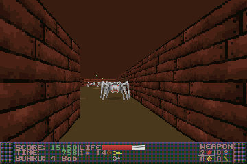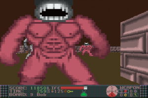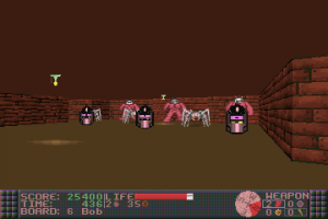 At this early point in the engine, the graphics aren’t too far beyond what Wolfenstein had to offer, with all walls and ceilings left untextured at all times. While there’s a pretty wide variety of enemies to fight, they’re generally rather goofy looking, and only have a handful of frames each. Enemies vanish entirely when killed, making for a rare exception in the ultraviolence that would soon become such a large part of the genre. The sound effects have a similarly ‘homemade’ feel as the rest of the game, with a few effects, like explosions, sounding like they came directly from somebody’s mouth. The music is incredibly difficult to describe, with only fragments like ‘infomercial-like’ coming to mind. It’s usually upbeat, if fairly slow in tempo, but loops so quickly that it soon grows somewhat obnoxious.