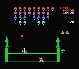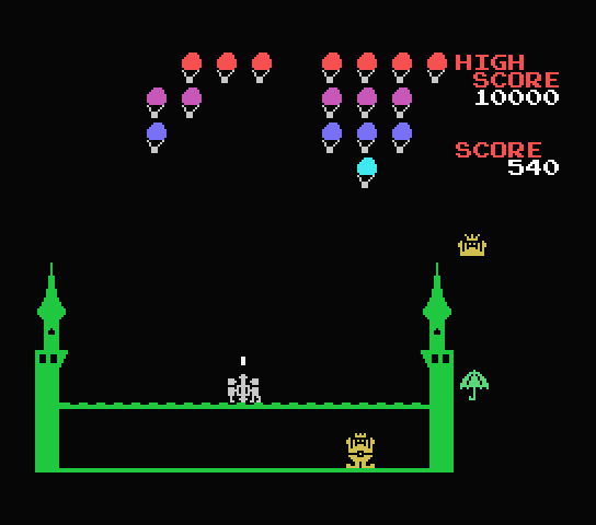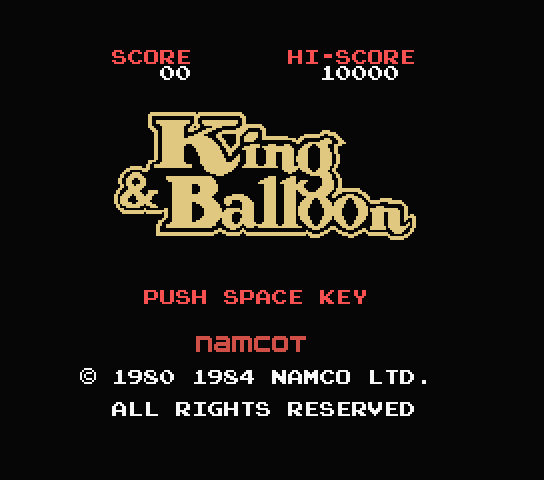 Released by Namco in the summer of 1980, King & Balloon is a shoot em up in the vein of Galaxian, but trades the outer space theme for pseudo-medieval setting. In the game, the player controls two green men who carry a cannon, as they defend the king below them from getting abducted by the balloons above, which keep invading the lower part of the screen while also shooting projectiles. Once all the balloons are shot down, the game moves on to the next level.
