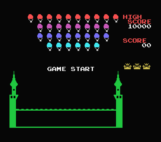 Despite the interesting gimmicks, King & Balloon feels cheap in some core areas. A lot of the sounds are reused from Galaxian, including the droning sound of the balloons and the shots of the cannon. The graphics, while intelligible, still have some odd color choices. The king, with his red eyes, black face, and yellow body looks more like some kind of evil robot. The balloons also have less detail than the Galaxian aliens, so it feels like a step down in a way. The use of gray for one of the balloons but blues for the castle is also sort of bizarre. Much like Galaxian, the game repeats after 48 levels.