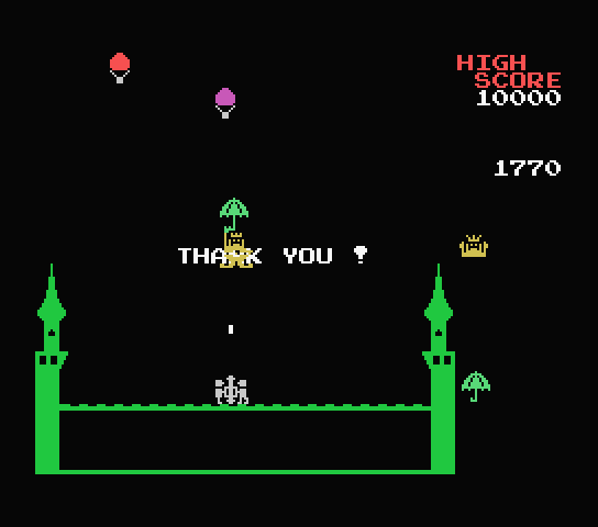 King & Balloon was also one of the first games to have speech synthesis, and it still holds up better than most contemporary or even later examples. The king says “Help!” when abducted, “Thank You!” when rescued, and “Bye bye!” when he leaves the screen. There are actually different voices for the game in Japan and the US version, with the Japan version having a slight Japanese accent.