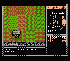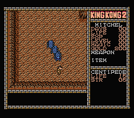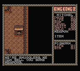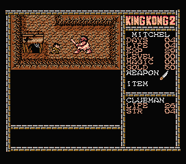After the title screen you watch Hank arrive on the island of Golnebo (as opposed to Borneo in the film) and that’s when it should be made clear that this isn’t going to be the light-hearted arcade-style fare of the Famicom game. Firstly on the right-hand side of the screen there is a panel with a list of statistics such as Life, EXP, Level, and Gold. Entering the hut in front of you you are told that in order to journey deeper into the island you must first consult the Village Elders for guidance, and this is when you realise that you’re playing an RPG, an action RPG to be precise in a vein similar to Falcom’s Ys, Telenet Japan’s Exile, and T&E Soft’s Hydlide series. If there is one genre that doesn’t leap to mind when one thinks of how a King Kong game would play it is certainly an RPG; yet it works so well in this case that it’s easy to get so immersed in the gameplay that you almost completely forget that you are playing a game with Kong in it.