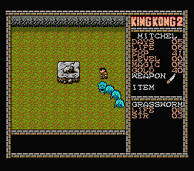With enough searching the player will learn from some smugglers hiding in a hut that only an axe can harm the bear and only a knife will harm the giant spider and they happen to have both for sale. Quelle Surprise! Trying to buy the axe at this point is impossible even if you had the funds, which makes the bear boss something of a beginner’s trap. Getting the knife will still set you back 200 Gold, something which shouldn’t be underestimated. Make no illusions to get this kind of money and still be in a chance to get the better two endings it is imperative to grind, which seasoned RPG players will be accustomed to but somehow comes out even more as a chore. You will find yourself between screens defeating enemies to get gold and experience and occasionally the odd herb or two. The enemies in this game are a little more appropriate for the setting than Megaton Punch‘s gallery of rogues. Warthogs, giant worms, and poison frogs are all animals you would believe to be lurking in a jungle even if they have some strange alterations such as size and color. There are also what appear to be cavemen, though they may be supposed to represent tribesmen indigenous to the island.