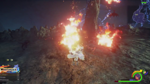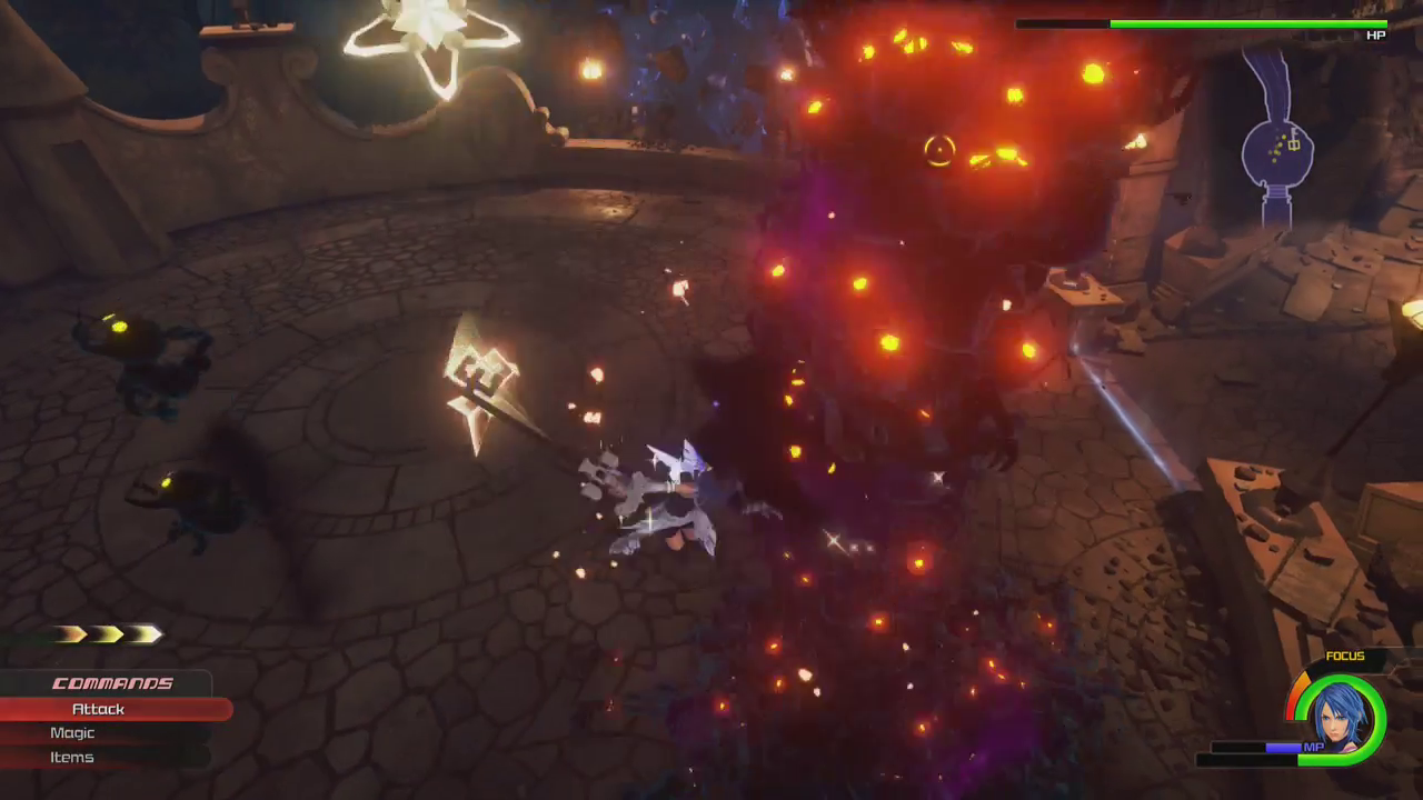 Still, a pseudo-demo is a pseudo-demo. Players get to gawk at Kingdom Hearts 3‘s impressive graphics tech, and fight using early versions of its combat mechanics. Aqua retains her Shotlocks from Birth by Sleep, and can activate her starting Command Style from Birth by Sleep using a feature that would be expanded in Kingdom Hearts 3. Her spells (all top-tier “-ga” spells to reflect her continuing off of the end of Birth by Sleep) are used in a fashion reminiscent of Kingdom Hearts 2, complete with magic meter that drops to 0 when you use Cure. Enemies are a mix of old and new, and all the new ones, including the bosses, would all appear in Kingdom Hearts 3.