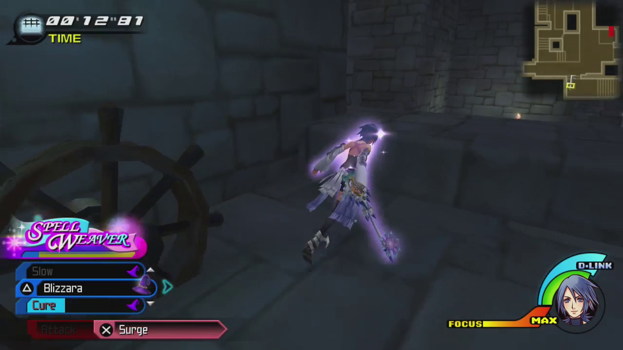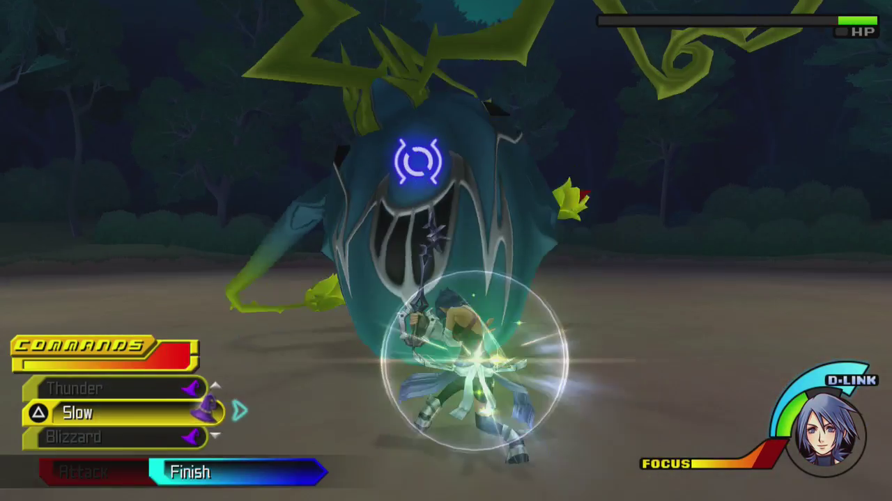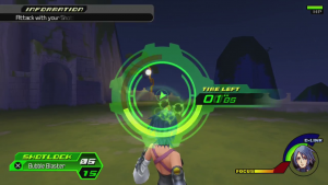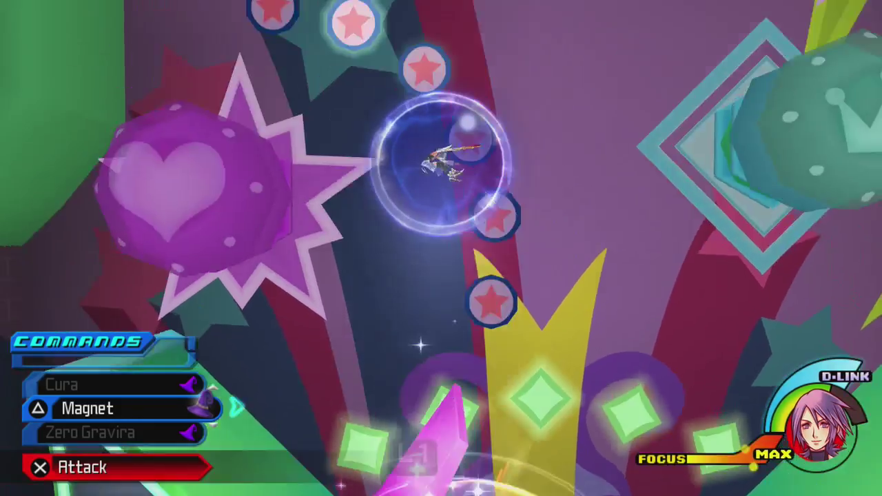 But Birth by Sleep didn’t stop at just the Command Deck, oh no. Next up are the Shotlocks, a special attack you can use by holding L and R, going into first person view and rapidly racking up “locks” on one or more enemies before bombarding them with projectiles or dash attacks. Then there are the D-Links, which actually play an important role in the narrative. These allow you to “link” with friends your character has made during the story to use alternate Command Decks related to them, sometimes with rare commands and always with special, albeit tedious, Finish attacks. In the original PSP releases, you can even link up with a friend and use their deck as a bonus D-Link!