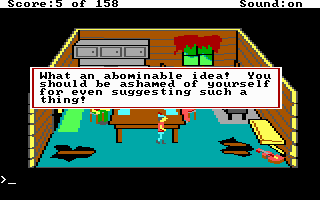 The music is of course sparse, with the main theme being a simple rendition of “Greensleeves”. Outside of occasional sound effects and various ditties, the only other music is played when you die, which is a standard death theme with a jaunty little finish. The Game Over window includes a message from Sierra thanking you for playing and even offers some encouragement if your score is high enough.