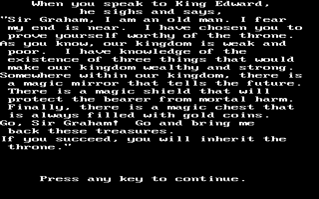 The Great King Edward, kind ruler of the Kingdom of Daventry, is old and frail. With no heirs, he tasks his loyal knight, Sir Graham, with a quest: hunt down three magic artifacts and bring them back, and he shall bequeath the throne. This is about all the guidance you get, and Graham is left to wander the land searching for them. The artifacts include the mirror, which can predict the future and is guarded by a fire-breathing dragon; the shield, which can protect the user from mortal harm and has been stolen by a group of leprechauns; and the chest, which has a limitless supply of gold coins and is in the possession of a giant who lives up in the clouds.
