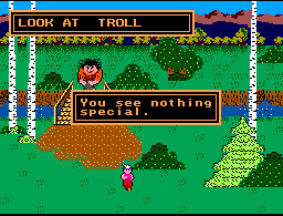 Daventry runs eight screens east and west, and six screens north and south, wrapping around infinitely. The supplementary documentation explains this bit of video game phenomenon as “The Magical Law of Containment”, which prevents characters from leaving the land. At least a few of the essential items are found simply by looking in tree stumps or moving rocks. Some puzzles involve a degree of knowledge of fairy tales – it’s quite fun to enter the gingerbread house, open up the stove, hide in the back room, wait for the witch to enter, and then shove her into the flames. Less fun is trying to guess the name of the mysterious gnome. It’s pretty clearly supposed to be Rumpelstiltskin, with a twist – you’re supposed to “think backwards”. One would assume that you simply spell his name in reverse, but no – it’s his name spelled in the backwards alphabet, with Z being substituted for A, Y for B and so on. Therefore, the correct solution is actually “Ifnkvohgroghprm”, which is ridiculous. The 1990 remake actually fixes this puzzle so the game will accept the more logical “Nikstlitslepmur”.