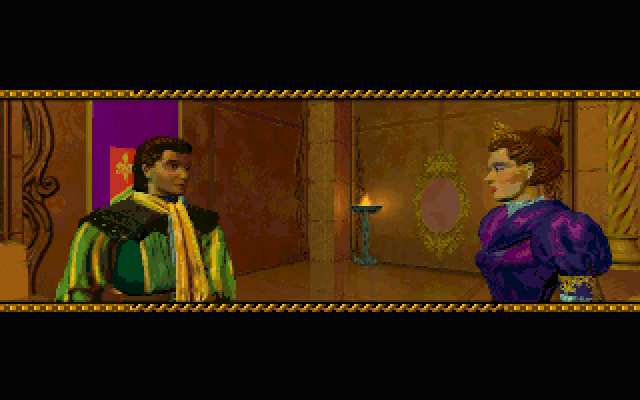 King’s Quest VI also benefits from Sierra’s experience as a multimedia studio. The voice acting is far, far better, having benefited from professional actors this time around. Alexander is played by Robbie Benson, best known as the Beast from Disney’s Beauty and the Beast, and he brings much dignity and enthusiasm to the otherwise standard role. Both versions, disk and CD, include a rendered intro depicting Alexander’s visions, his conversations with his mother, and his journey across the sea. Each version has slightly different cuts of this movie, with the CD version obviously being the longest. The disk version also uses completely different (and worse) voice actors. While Sierra made a big deal about these movies at the time, they’ve aged badly, suffering from ugly characters and an extremely choppy frame rate. More interesting is the vocal song, “Girl in the Tower”, a love ballad duet clearly trying to ride the coattails of similar Disney songs from Aladdin and Beauty and the Beast. It’s bland but tolerable, and certain CD versions have it playable as a redbook audio track. The original release had a list of phone numbers of radio stations who’d been provided a copy of the song, urging customers to call it and request it for on-air play. While it was a neat marketing ploy, the song itself obviously never caught on. The Windows version features high res character portraits, although the rest of the visuals are the same as the other versions.