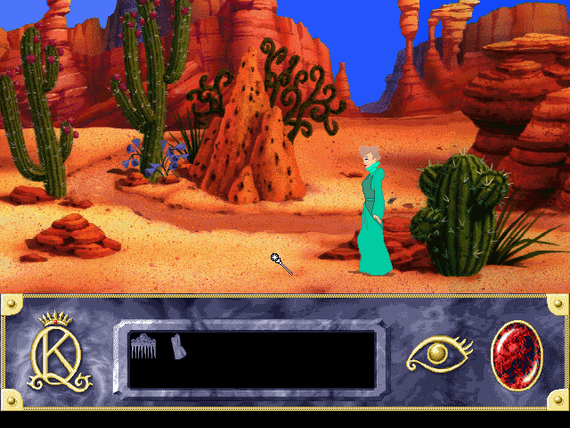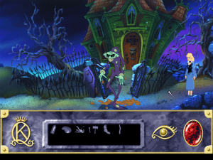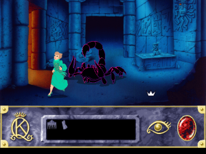 Although there are technically death sequences, you can pick up immediately before your fatal move. While this reduces some frustration, the save system has been cut down so you can only record one game at a time anyway. Instead of saving your progress in multiple spots, you simply move the “bookmark” to the new spot when you quit. It is also entirely impossible to make the game unwinnable, one of the few steps KQVII makes in the right direction. However, in keeping with the spirit of the older games, in certain areas it will randomly bring a dangerous character on screen, forcing you to exit quickly or be killed.