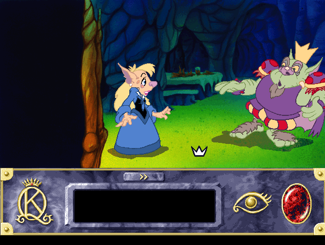 The King’s Quest series were always meant to be family games, but the animated stylings, along with the generally broad themes, makes it feel markedly less mature than King’s Quest VI. In fact, it really does feel remarkably shallow, beyond just being “kiddie”. It uses the same basic interface as Phantasmagoria, meaning it only uses a single icon for moving your character or interacting with the environment. While perhaps done to make the game easier to play for non-adventure fans, without a “Look” icon, it completely removes the details of your surroundings.