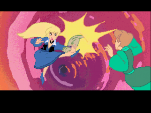 The developers at the time probably figured no one would mind, because it looks so gorgeous. Because hey! You’re literally playing a cartoon! To its credit, the game does look pretty damn good. The backgrounds are gorgeous, now that the visuals support SVGA graphics, and the paintings no longer suffer from the dithering that permeated the older SCI games. And for all of the time you spend watching people trot along, they are remarkably well animated, to the point where each action has incredibly fluid, unique frames of animation. And from a distance, the character artwork looks pretty good too – not on par with Disney, or even Don Bluth, but a fair bit better than the average Saturday morning cartoon. The few full motion video cutscenes don’t fare as well, though, as they’re hastily drawn, badly detailed, and suffer from both a low resolution and a dismal frame rate.