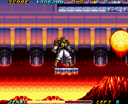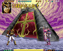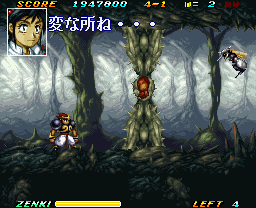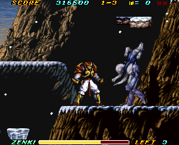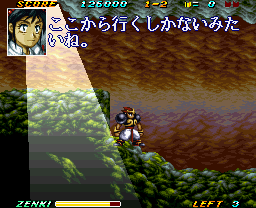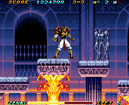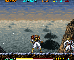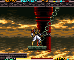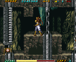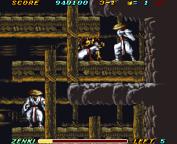 In a powered-up state you also have access to a Power Bomb move, represented by the scrolls in the upper right corner, which attacks everything on screen and depletes a large portion of any boss’ HP. The catch is it also drains your own energy, and three consecutive uses drops you down to a tiny sliver. Although these attacks can be replenished by collecting items around the stages, you’re almost always better off never using them. Unless of course a boss is on its last legs, in which case bombs away. Powered-up Zenki can also perform special moves while holding the d-pad, for example activating a powerful tornado attack while pressing up, that can attack flying enemies.