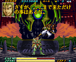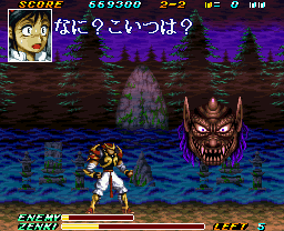 Throughout the game you only ever control Zenki himself, though Chiaki does pop up in cut-scenes to turn him into his Super Saiyan form. Zenki tends to alternate between forms, starting off small, beating a stage’s mid-boss, and then becoming big for the secondary stage and final boss, after which he usually shifts back into a kid. You’ve got an attack button, which needs to be rapidly tapped to pull off combos, and a jump button, which can be combined with attack for some flying kicks. There’s also a back- and forwards dash, using L and R, though it’s seldom if ever needed. Generally the controls are slow and clunky; the walking speed of Zenki in either form is like molasses, while the jumping feels stiff and weighted. There are a fair few platforming sections, but they’re generally quite easy and don’t require much precision.