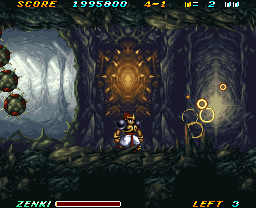 The most inventive thing about Battle Raiden are the stage layouts. While at first you’ll usually be moving from left-to-right, aiming for the exit, once reached you’ll get a dialogue box explaining how a series of shrines need to be destroyed to drop a force-field. These will then immediately pop up behind you, and as you destroy them parts of the stage will change. To begin with most are a straight run, and you can sort of see platforms too high to reach in the distance, or sections you can’t get to. But as some shrines are broken a set of floating platforms will appear, or the layout will change in other ways. It’s actually a neat idea, adding some mild exploration to things. The problem is in a couple of stages which are quite long, and it’s tedious having to backtrack to a wall which you clearly knew you’d have to go through eventually. The diversity between stages helps though: one moment you’re in an eerie forest, the next an underground rainbow cavern. Then you’re on a snowy mountaintop, afterwards a misty graveyard, followed by a high-speed run over wooden logs on a rapidly flowing river. The lava shrine and mythical palace in the heavens are another two especially fun levels to play through.