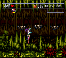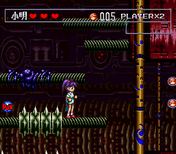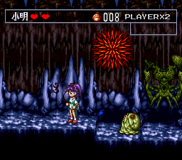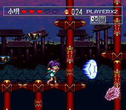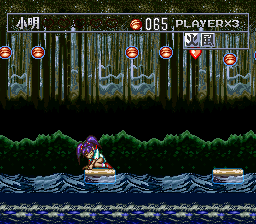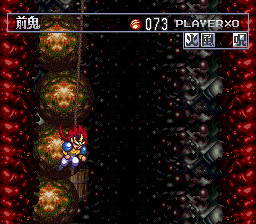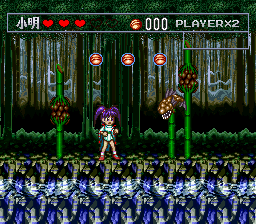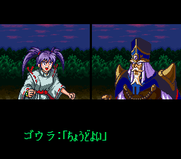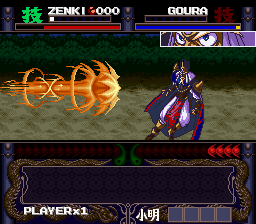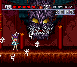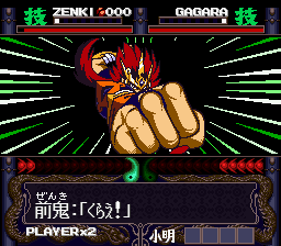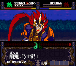 This is why it seems to be two separate games stuck together. Right after the realistically drawn fight scenes (well, as realistic as green aliens can be), you’re suddenly dropped into a ridiculously easy platformer, controlling adorable-looking chibi versions of the main characters. It doesn’t make any sense. It’s actually pretty fun though, in a silly sort of way. You control Chiaki, traversing floating platforms and collecting little kanji symbols until you the reach the end, whereupon she calls up Zenki (in his child form) to battle a rather easy boss. After a couple of these it switches over to a few back-to-back first-person battles, and then back to platforming again.