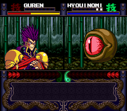 The third release, arriving on the SNES, is a really odd one. In fact it almost seems like two entirely different game projects that were forced together at the last moment, simply to get a saleable product out the door. Upon loading it up, Denei Live appears to be a one-on-one, first-person, turn-based fighting game – like the kind you’d see done using FMV footage and awkward button prompts. The tone is all gritty and serious, as you attack an old man and afterwards a giant green… insect thing? Button combinations will launch attacks in time to various undulating energy meters, which the AI will almost invariably dodge, and when they attack you in return a quick press of up or down will likewise allow you to avoid it. So the tedium goes on until you switch the machine off.