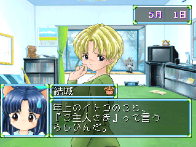 The truth of the matter is Kitty on your Lap is exactly what it appears to be at the surface. More specifically, the game directs all of its creative energy toward situating itself within the popular anime trends from that time. Each character, for example, exists less as an individual and more as a collection of appealing anime tropes. This is especially true of the catgirls, whose personality traits both align them within a given archetype and make them desirable romantic partners for the presumably male player. (This would explain why the catgirls are indistinguishable during play; Yuki will respond to watching TV the same as Mimi or Lena would.) And the larger narrative, lacking characters to explore and only possessing themes that dating sim convention has imposed on it, resigns itself to being a loose assortment of daily experiences for the player to participate in and not much else.