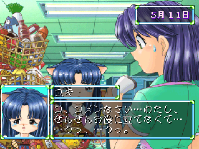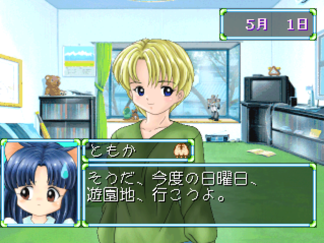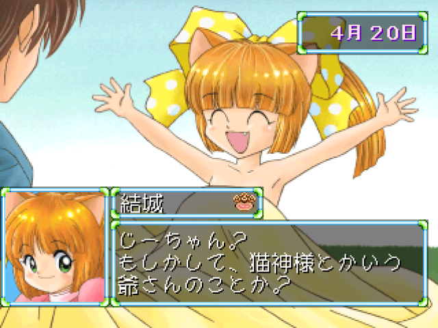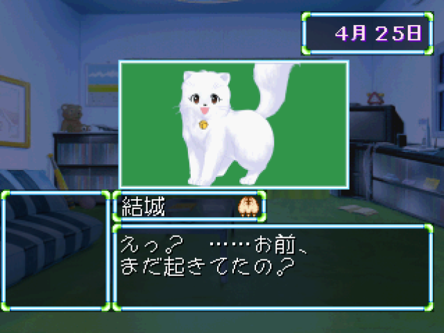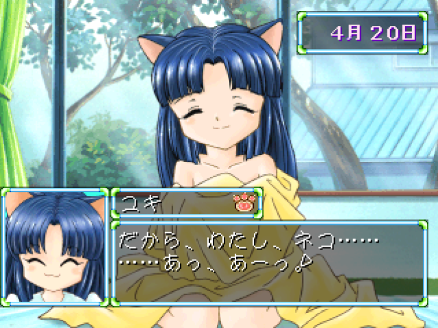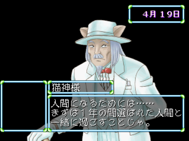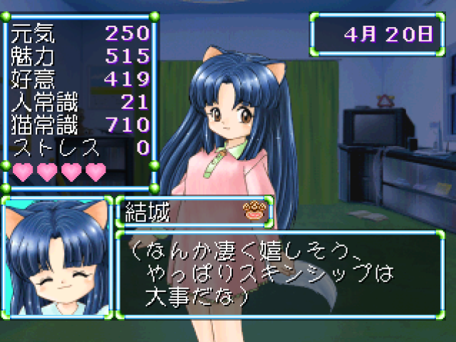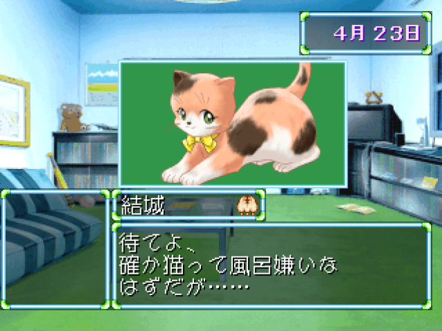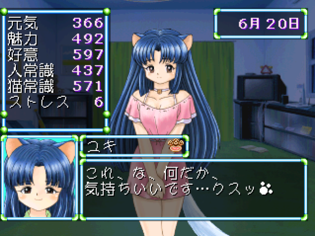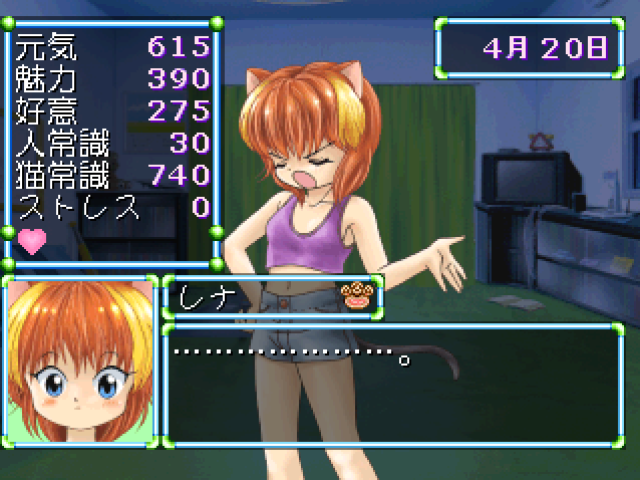 One needn’t play the game for very long to see the game somewhat lacks substance. After naming the protagonist, he goes on to relate his life story. A loner attending his first year at college, he lives by himself and doesn’t have many friends. This changes one April night when he finds three cats on the roadside and decides to adopt one. After a strange dream where an old man explains the task he has been entrusted with, the protagonist wakes up to find his cat transformed into an infant catgirl. From this point forward he must, on top of managing his classes and what little social life he has, spend the next year raising his feline daughter in the hopes that she’ll become a real human when she grows up.