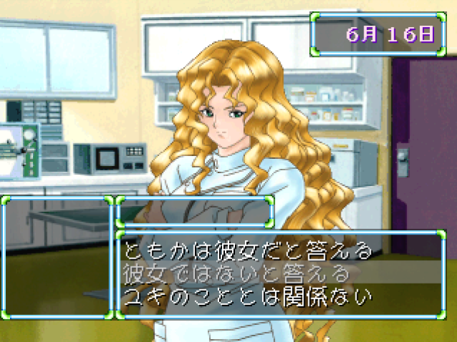 A college classmate and one of Kouichi’s only friends, the role Kobayashi serves is more important than his character. He wants to start a career making movies, but outside a student film festival, this point rarely comes up. He also has a crush on (and in some routes dates) Juri. And although it rarely comes up, he owns one of the other catgirls that neither Kouichi nor Tomoka do: Mimi if you chose Yuki, Lena if you chose Mimi, and Yuki if you chose Lena. For the most part, though, Kobayashi is there either to help the protagonist with his current problems or to get him into minor bits of trouble, especially romantically. Voiced by Nobutoshi Canna.