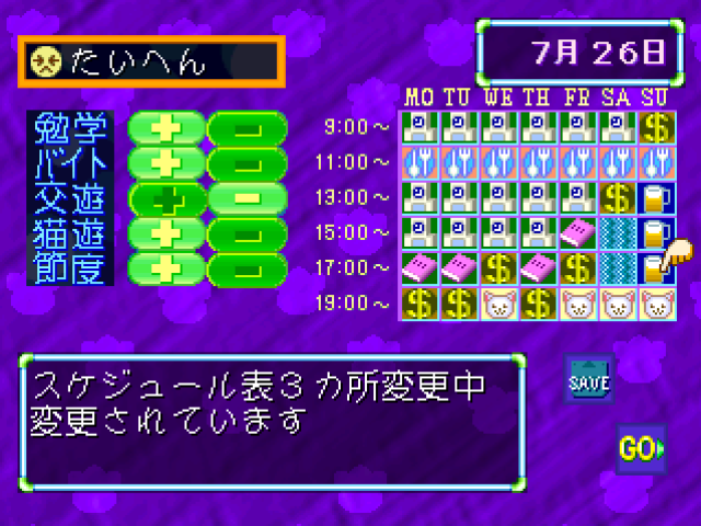 Such a reading assumes a lot on the game’s part; mostly that its project is thematic in nature. However, one can easily repudiate that assumption. So far Kitty on your Lap’s accomplishments have more to do with the genre it inhabits than with its own efforts, and looking at the latter, one gets the impression that it doesn’t realize that video game mechanics can be used expressively. In spite of any ideals about self-betterment, most playthroughs see Kouichi absolutely miserable: he can spend weeks at a time sick from stress, either missing school/work/etc. or going through the motions. The narrative never seems to acknowledge his ailments, and the actual mechanics of play breeze right through the daily life they theoretically value. With a few exceptions, the player only sees that life as events on a calendar; as minor blips and as rolls of the dice, as though Kouichi has little control over his own life.