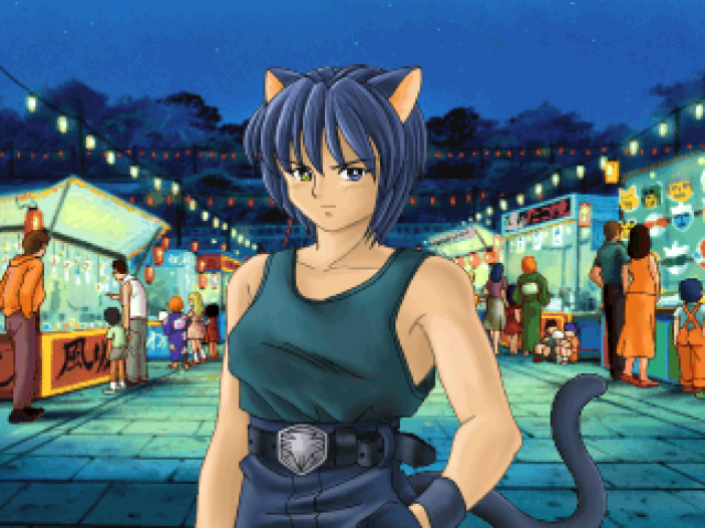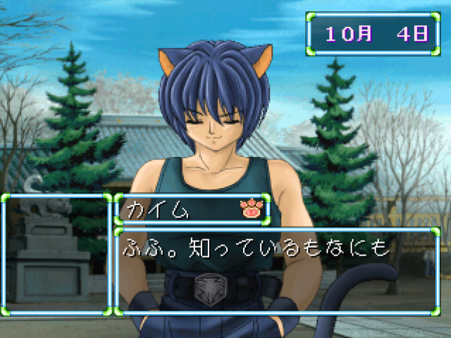 Kaim is the closest thing the game has to an antagonist. By day a black cat renowned for fending off evil spirits in town, he can become a human like the three catgirls. Unlike them, though, his opinions of humanity are far more negative. He believes the inequalities between cats and humans make any bonds between them false, and that humans will throw away or commit violence against cats once those bonds break down. Although he introduces conflict into each route by telling the catgirls his feelings, it’s all but stated that those feelings are genuine on his front. In fact, some of the bad/neutral endings (where Kouichi abandons his daughter) depict him as a genuinely caring boyfriend. Voiced by Hikaru Midorikawa.